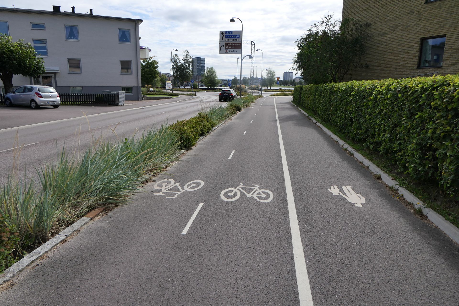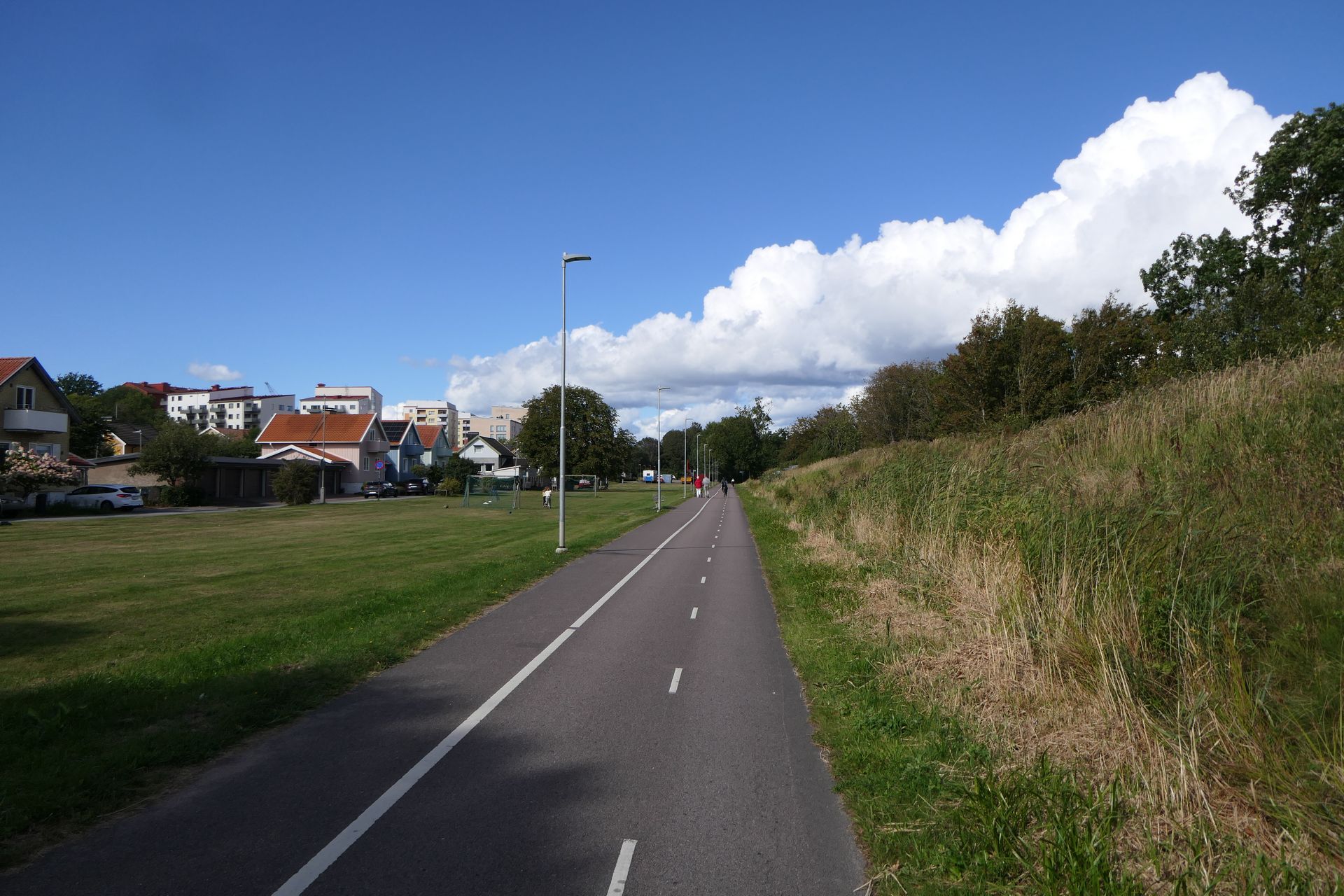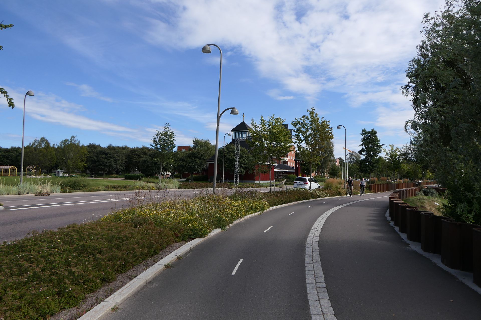 Na przedmieściach też dba się o wygodną infrastrukturę rowerową. W Szwedzkich miastach, za wyjątkiem ścisłych centrów, rzadko spotyka się chodniki z płyty lub kostki. Głównie są to asfaltowe ciągi pieszo rowerowe. Karlskrona.